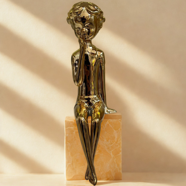 ESCULTURA PRATELEIRA LIVRO MENINO PENSATIVO DOURADO 35X12CM