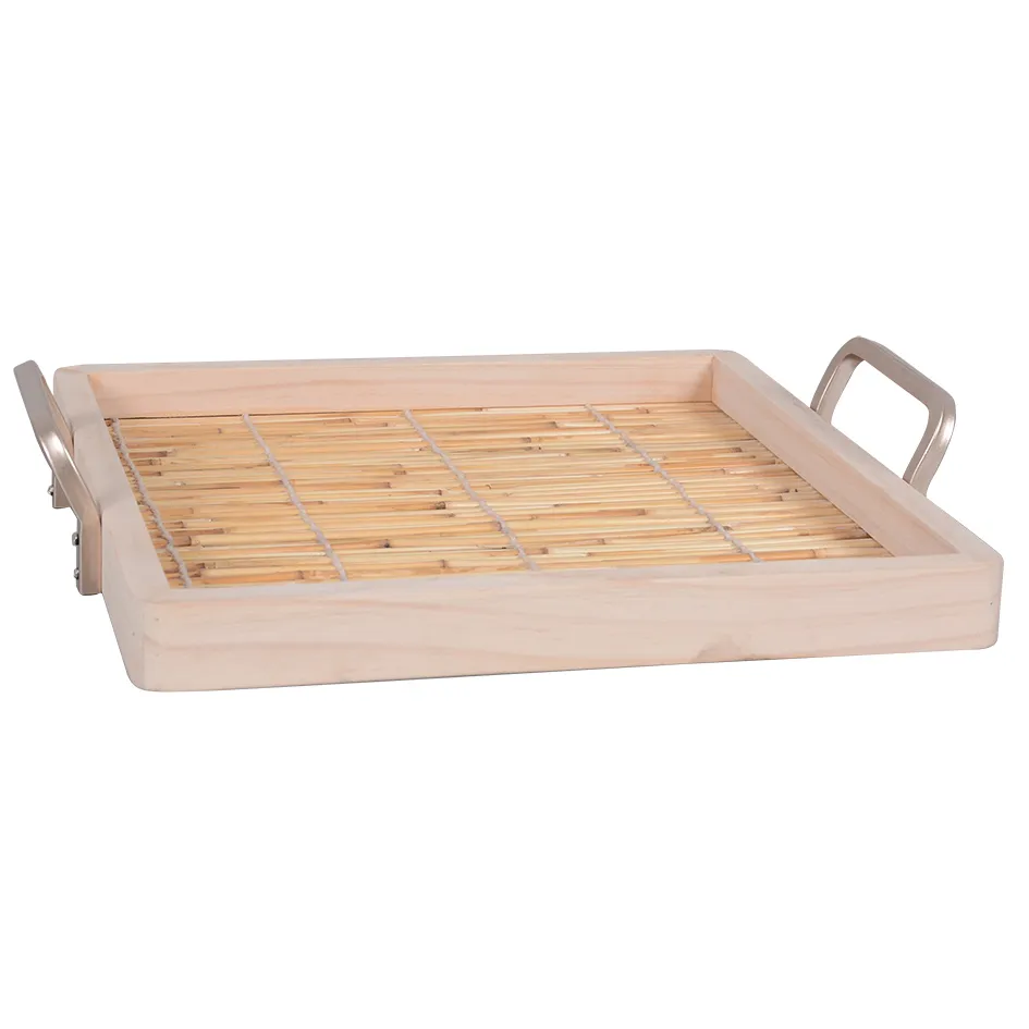 BANDEJA EM MADEIRA BAMBU E METAL BEGE QUADRADA 30,5X7CM