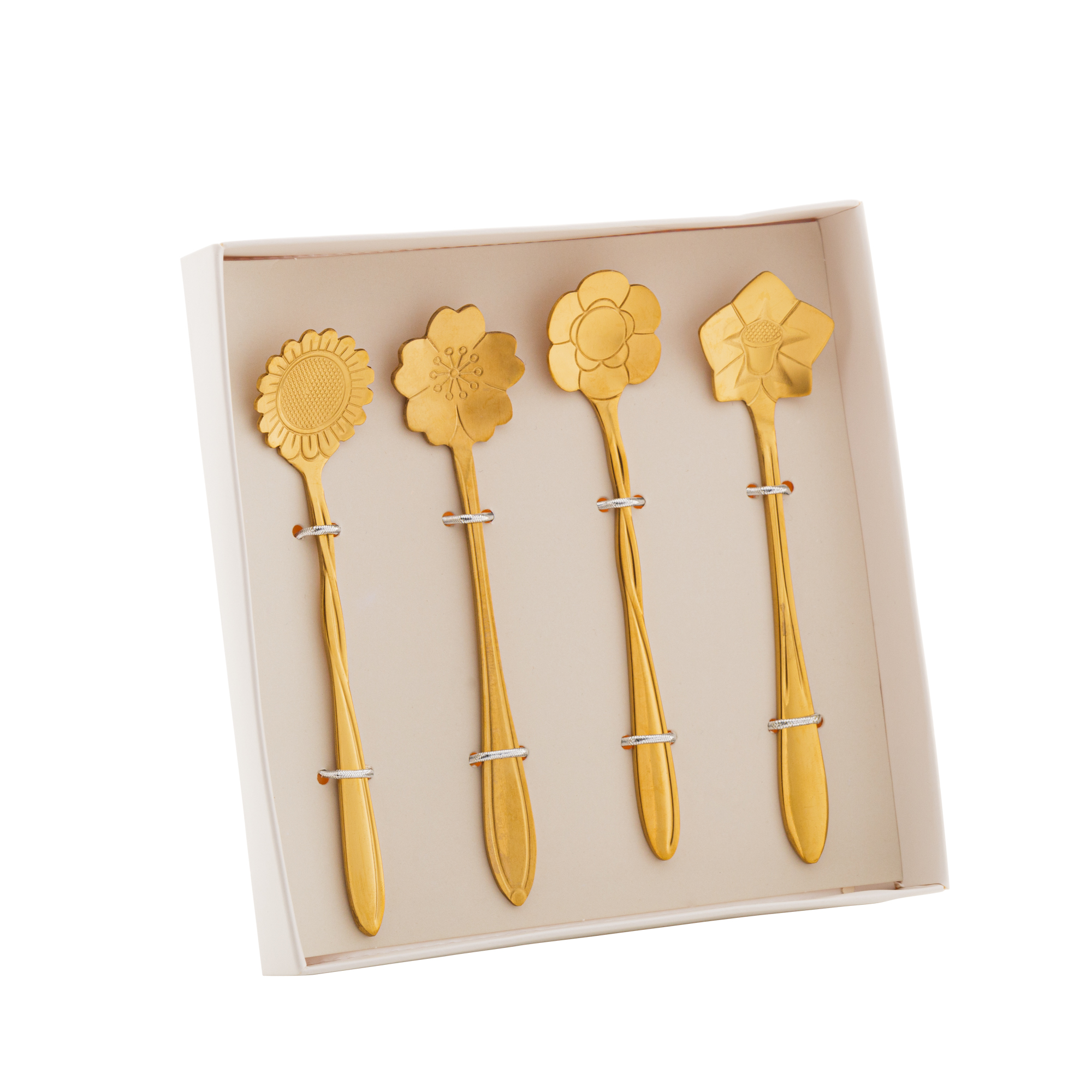 CJ 4 COLHERES ACO INOX P/CHA FLORES DOURADO