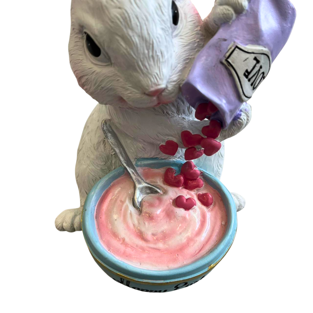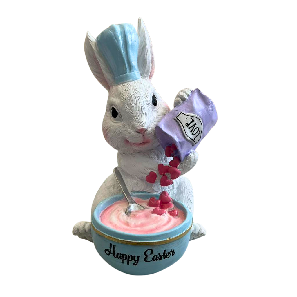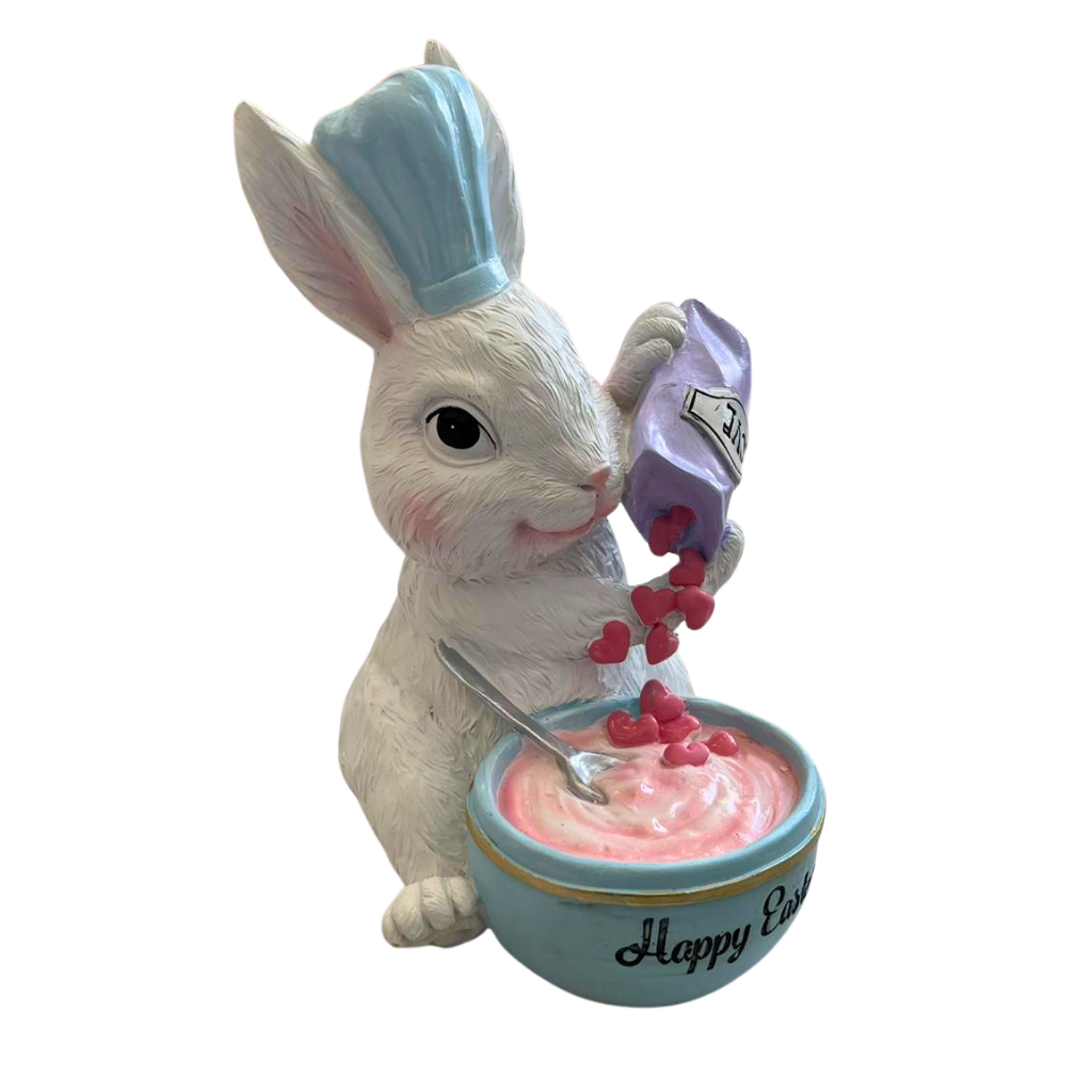 Transforme sua casa em um cenário mágico de Páscoa com este adorável coelho confeiteiro. Perfeito para decorar mesas, estantes ou presentear alguém especial, ele traz alegria e doçura para a celebração. Com detalhes encantadores e cores vibrantes, este coelho de resina é a peça que faltava para a sua decoração de Páscoa ficar completa.
