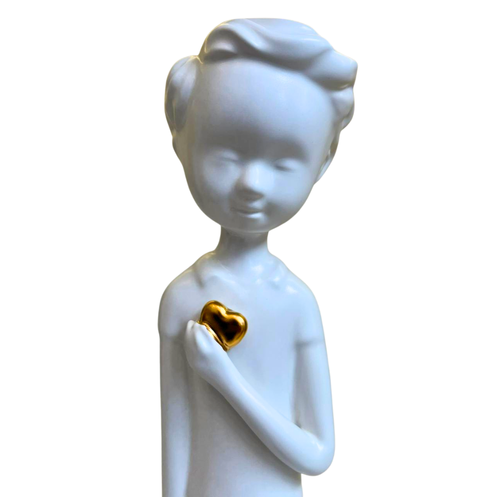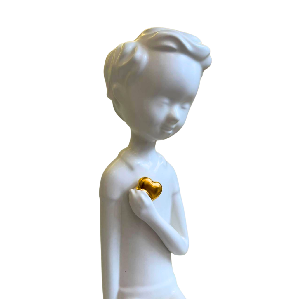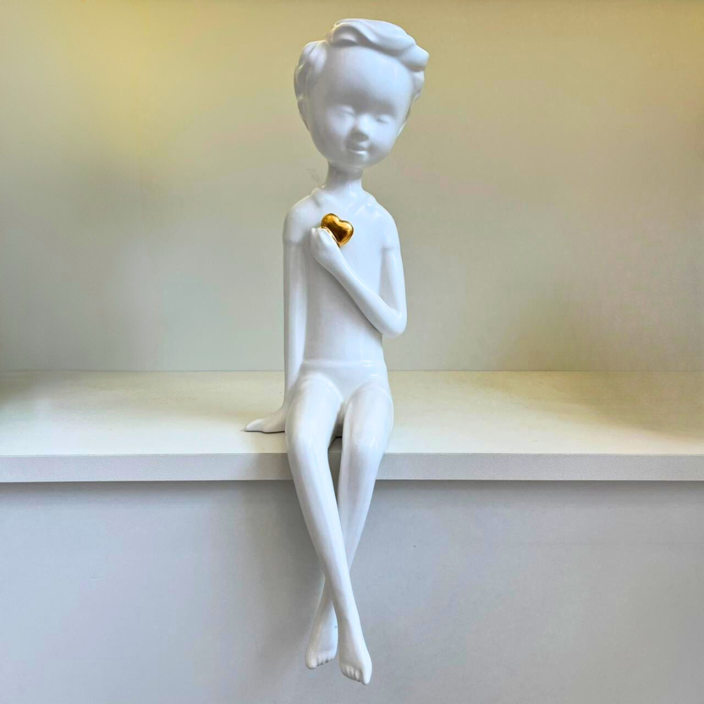 Adicione um toque de delicadeza e originalidade à sua decoração com esta linda escultura. Com suas medidas de 37x9x11cm, ela é ideal para dar vida a qualquer cantinho da sua casa ou escritório. A combinação do menino com o coração em dourado traz um ar de carinho e estilo único, perfeito para quem ama peças que contam histórias.